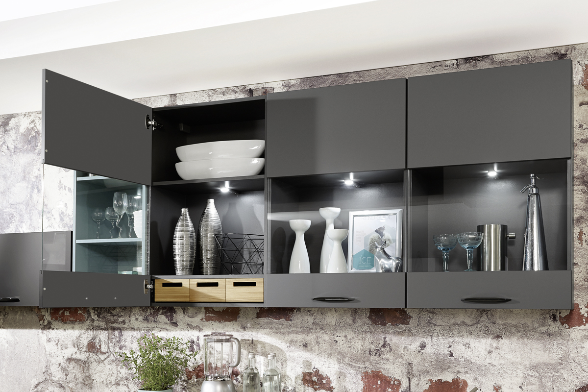 Inklusive Einbaubackofen Edelstahl Laurus LEB3 Energieeffizienzklasse A, Glaskeramik Kochfeld Laurus LCA600, Designesse Edelstahl / Schwarzglas Airforce F134-90 S4 BK Energieeffizienzklasse C, Kühlschrank Laurus LKG88E Energieeffizienzklasse E, Einbauspüle Edelstahl Rodi Okio Line 85 Deep, Unterschrank mit Frontauszügen, Wandschränken mit Segmentglastür.